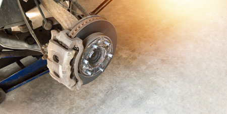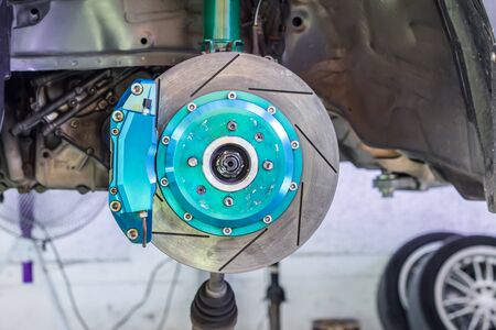 Close up caliper and disk of car on the hoist lift service and change spare part in maintenance shop