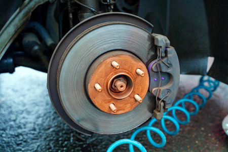 Close-up of the vehicle's disc brake in the garage for maintenance. Repairing the car's disc brake.