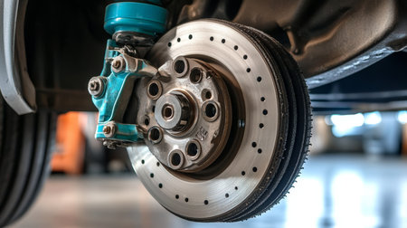 Intricate Metal Rotor of Vehicle Under Repair with Focus on Brake Assembly and Wheel Servicing