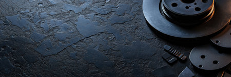 Durable brake pads and discs are arranged on a dark textured surface, leaving ample space for text or branding needs.