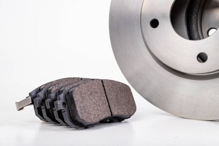 Steel brake discs and brake pads for a passenger car. New spare parts for car repairs. White background.