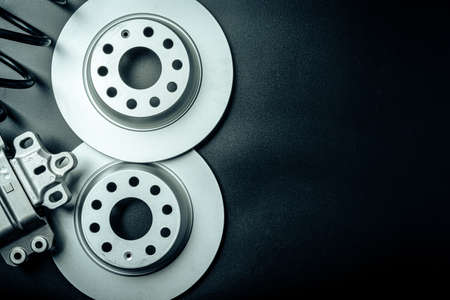 Car parts. Break disc on black background close up