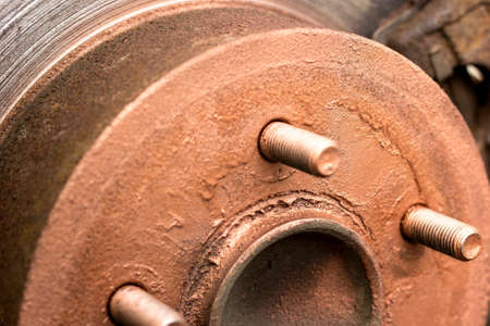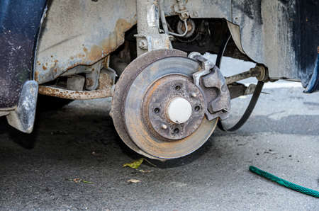 Old and rusty car's suspension parts. Rusted disc brake and caliper on the car. Automotive industry and garage concepts. Selective focus