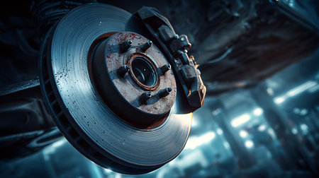 Intricate Metal Rotor of Vehicle Under Repair with Focus on Brake Assembly and Wheel Servicing