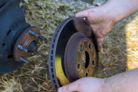 Garage repair of a passenger car. Inspection of an old brake disc in need of replacement.