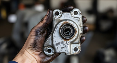 A mechanic's greasy, dirty hand holds up a used metal car part, possibly a bearing or mount, for inspection. The background is a blurred auto repair shop, emphasizing the hands-on nature of vehicle maintenance.