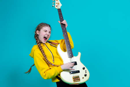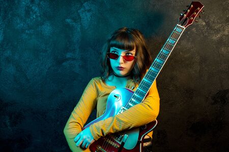 Fashion young hipster woman with curly hair with red guitar in neon lights. Rock musician is playing electrical guitar. 90s style concept.