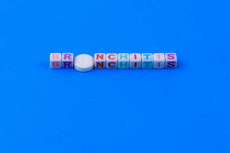 BRONCHITIS text made in cubes, a white medical pill with a score instead of the letter O. Classic traditional blue background.
