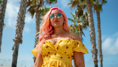 Young woman with pink hair is standing under palm trees in a yellow dress and sunglasses