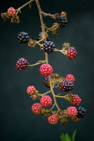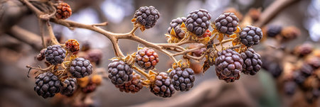 Ripe blackberries hanging on a dry branch against a dark blurred forest background. Natures fruits reflecting autumns beauty and richness.