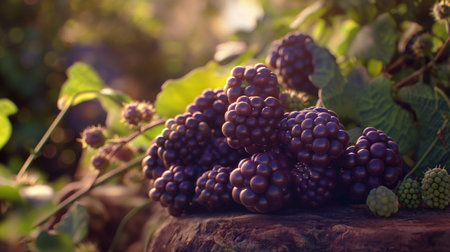 Close up of fresh blackberries nestled among lush green foliage in a vibrant garden setting
