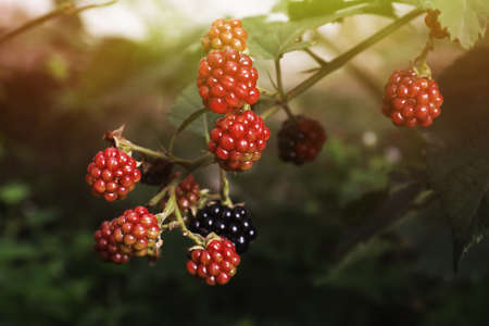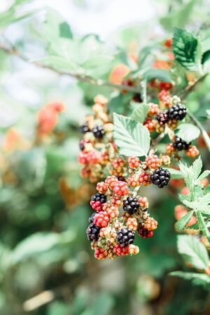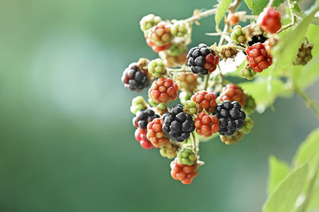 Ripe and unripe blackberries on the bush with selective focus. Bunch of berries.