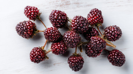 A beautiful array of fresh blackberries positioned on a light grey surface, perfect for showcasing their luscious texture and appealing color in food photography.