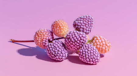 A beautiful arrangement of colorful raspberries on a soft pink background, perfect for showcasing freshness and health in any food-related design or project.