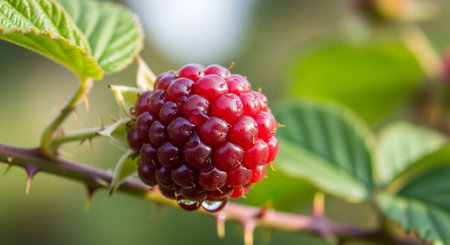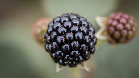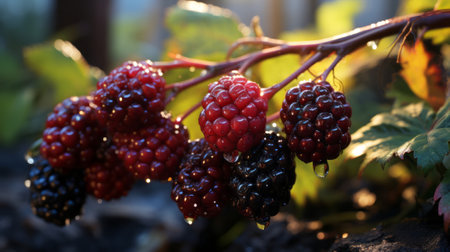 Ripe blackberry hangs from a green plant, surrounded by leaves and unripe berries. Soft light casts a warm glow, highlighting the details of the fruit in a tranquil garden setting.