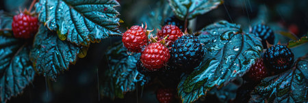 Fresh blackberries and dew-covered leaves in a lush garden nature scene