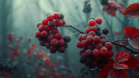 Ripe blackberries hanging on a dry branch against a dark blurred forest background. Natures fruits reflecting autumns beauty and richness.