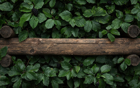 Fresh blackberries and dew-covered leaves in a lush garden nature scene