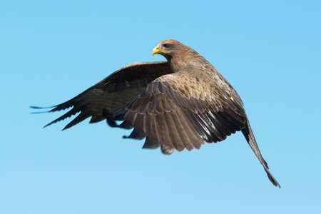 Gurney's eagle, Aquila gurney in flight in Senegal, Africa. Close up photo of big eagle. It is wildlife photo. There is blue sky. There is sunny day.