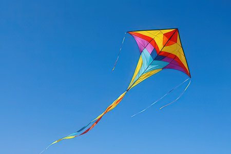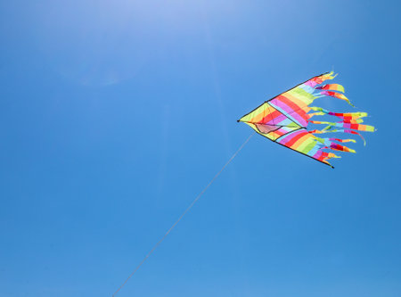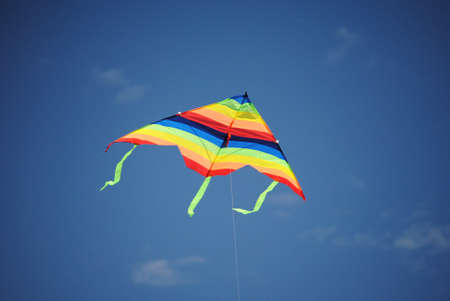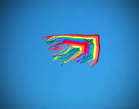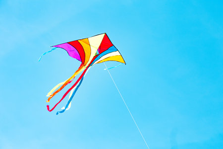 multicolored flying kite toy vibrating in the blue sky symbol of freedom joy