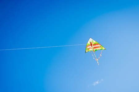 One colorful kite flying in blue sky