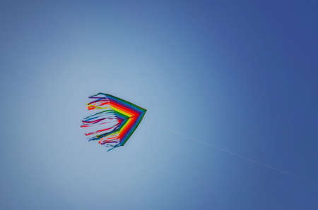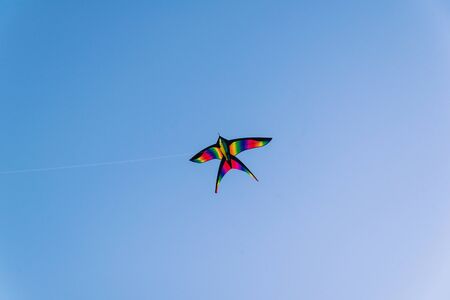 Rainbow kite flying in blue sky in sunny day in summer. Childhood concept.