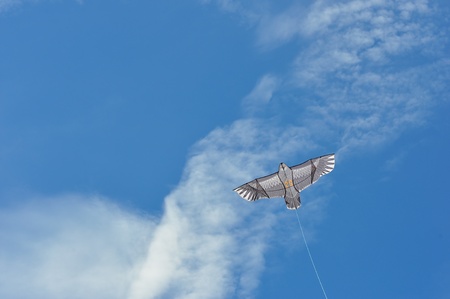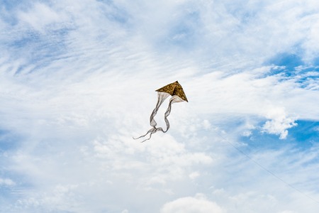 kite flying in the blue sky with white clouds, closeup
