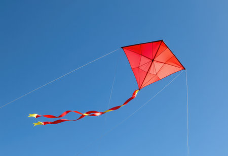 A vibrant red kite soars high in a clear blue sky its long tail streaming behind it.