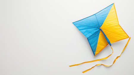 Blue and yellow kite with tails against white background
