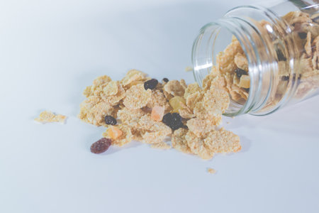 Corn flakes in a glass jar on white wooden surface. Place for your text.