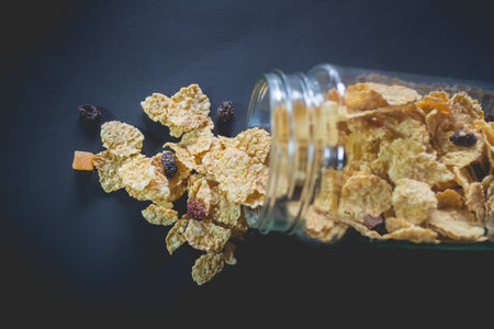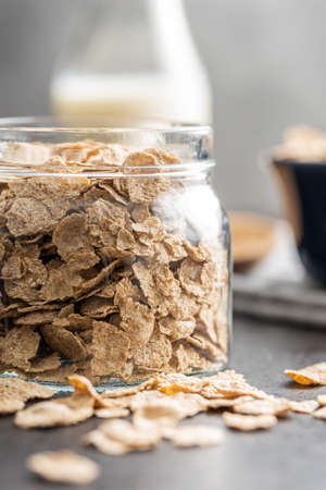 Whole grain cereal flakes. Wholegrain breakfast cereals in a jar on a kitchen table.