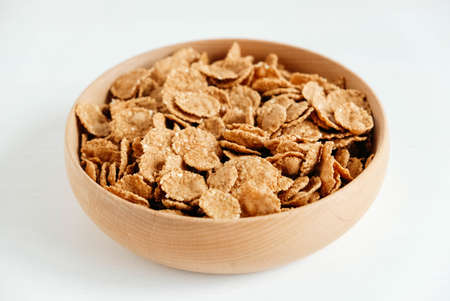 Crispy healthy dry cereal flakes in a wooden bowl on white background.