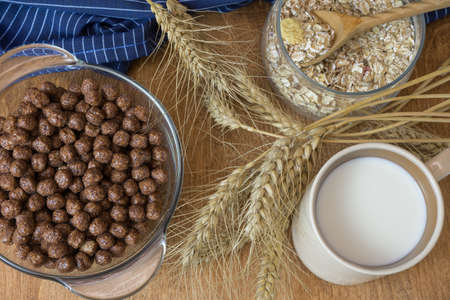 Multigrain healthy cereal corn pads chocolate in a white bowl for milk breakfast, glass of milk, cereal bank, cereal is scattered on a table on a light wooden background surface