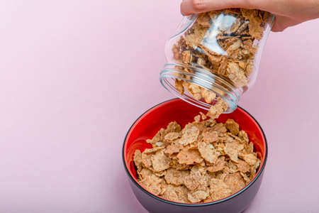 Muesli on a pink background. Pour dry muesli flakes by hand into a bowl. Pouring muesli from a glass jar into a black bowl when making cereals with muesli.
