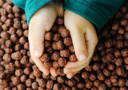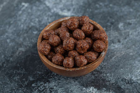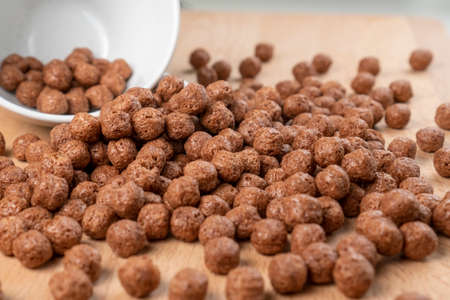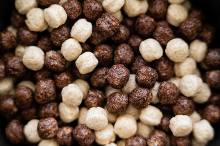 Crunchy chocolate cereal. Textured flakes balls. Macro