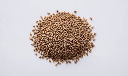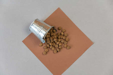 Dry pelleted dog food has spilled out of the bucket. A small silvery thigh of dog food lies against the gray background. A square brown piece of paper with a scattering of pellets.