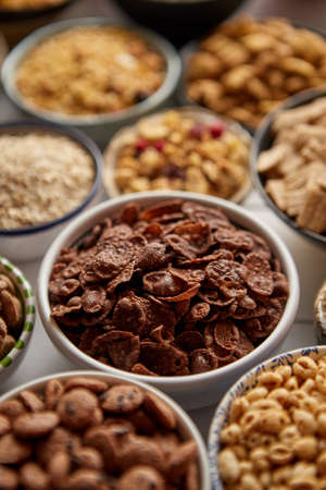 Close up and selective focus. Composition of different kinds cereals placed in ceramic bowls with cornflakes, granola, cereals and oatmeal. Flat lay, top view on white wooden table.