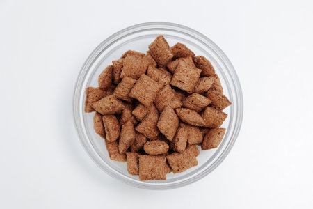 heap of chocolate pads isolated on white background, chocolate corn pads, healthy breakfast, top view