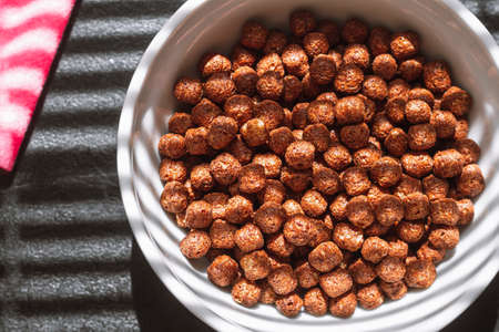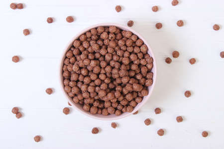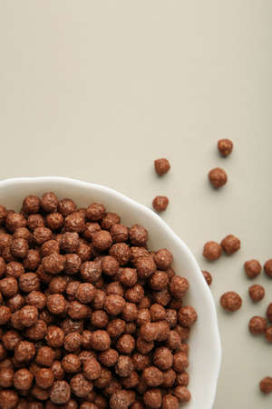 Chocolate cereal corn balls in a white bowl on a gray background. top view.