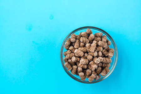 Sweet breakfast cereal dry - chocolate pads made of cereals on a blue background, viewed from above