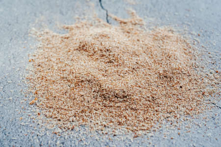 Organic brown palm or coconut sugar on brown paper background with copyspace. Minimalism.
