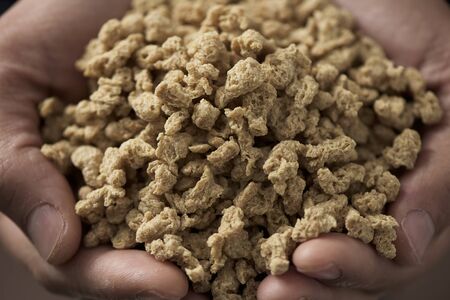 closeup of some chunks of textured soy protein in the hands of a young caucasian man