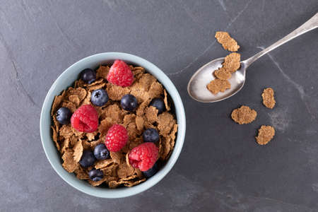 Directly above shot of blueberries and raspberries with cornflakes in bowl by spoon on food slate. unaltered, breakfast, organic, healthy food, snack and food concept.