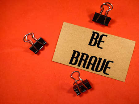 Business concept. Brown card with text BE BRAVE with paper clips on red background