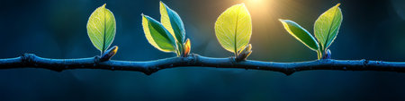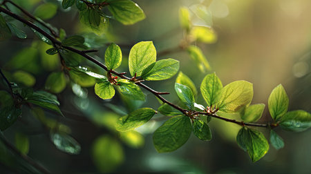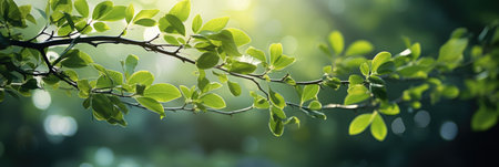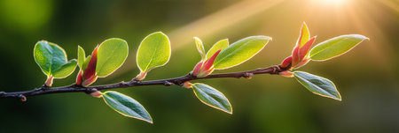 Springtime Branch with Delicate Green Foliage and Sunlit Background, Nature s Renewal