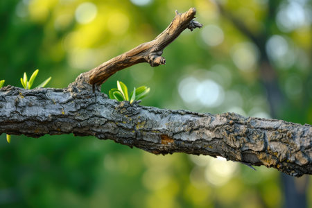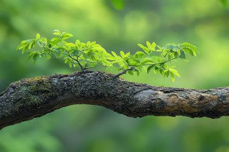 A rugged tree branch extending horizontally, adorned with vibrant green leaves, against a softly blurred green background, highlighting the beauty of nature.