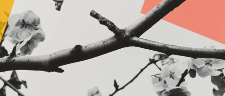 Minimalist collage featuring geometric shapes and a branch pruning on a white background