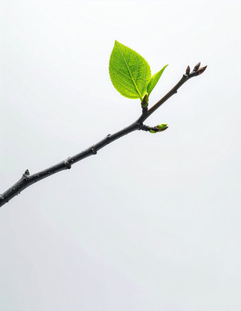 A single, vibrant green leaf unfurls from a dormant branch, a powerful symbol of new beginnings, hope, and the quiet resilience of nature. Set against a clean white background, this minimalist image captures the essence of springs arrival and the promise of growth and renewal.