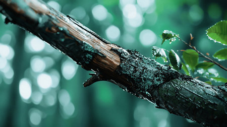 A close-up shot of a rain-soaked branch with peeling bark and glistening leaves, set against a blurred green forest backdrop, evoking a sense of tranquility.