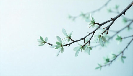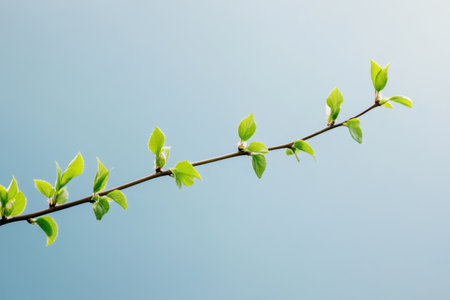 Tranquil image of a single branch with delicate buds and young leaves, symbolizing spring